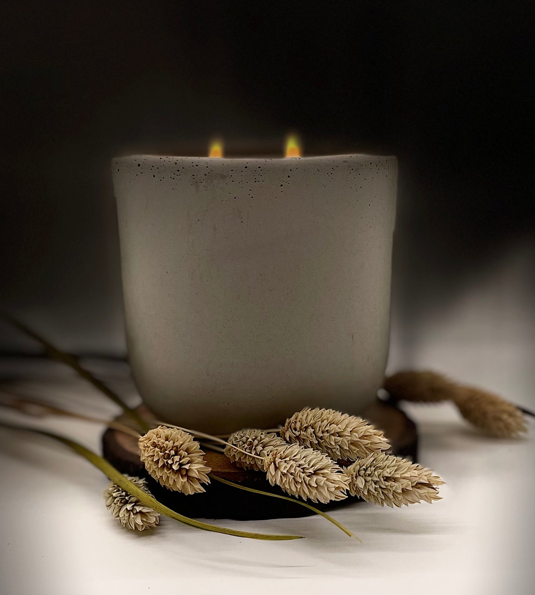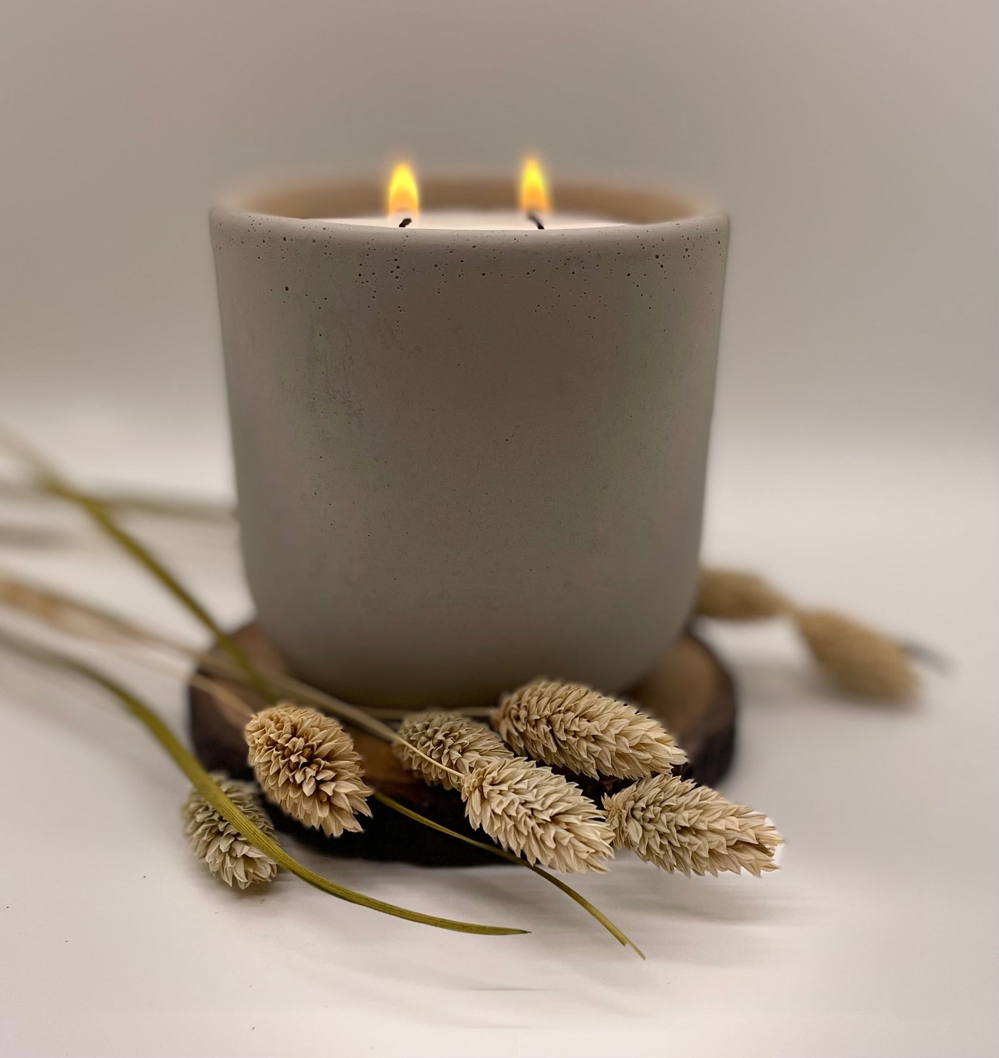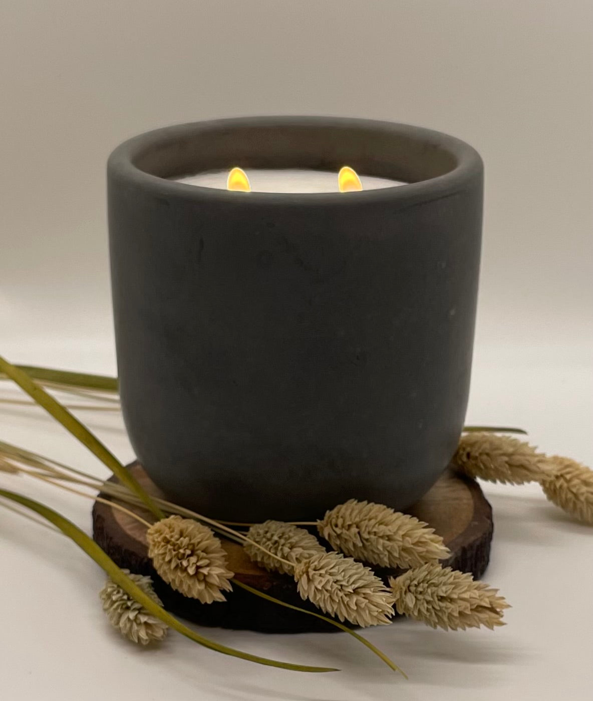 We pride ourselves on uniquely scented candles. Each candle is hand poured and our containers are handmade using concrete. We use a soy blend wax which results in a fragrant candle with a slow and clean burn. Our candles are double wicked which results in an even burn with stunning ambience.