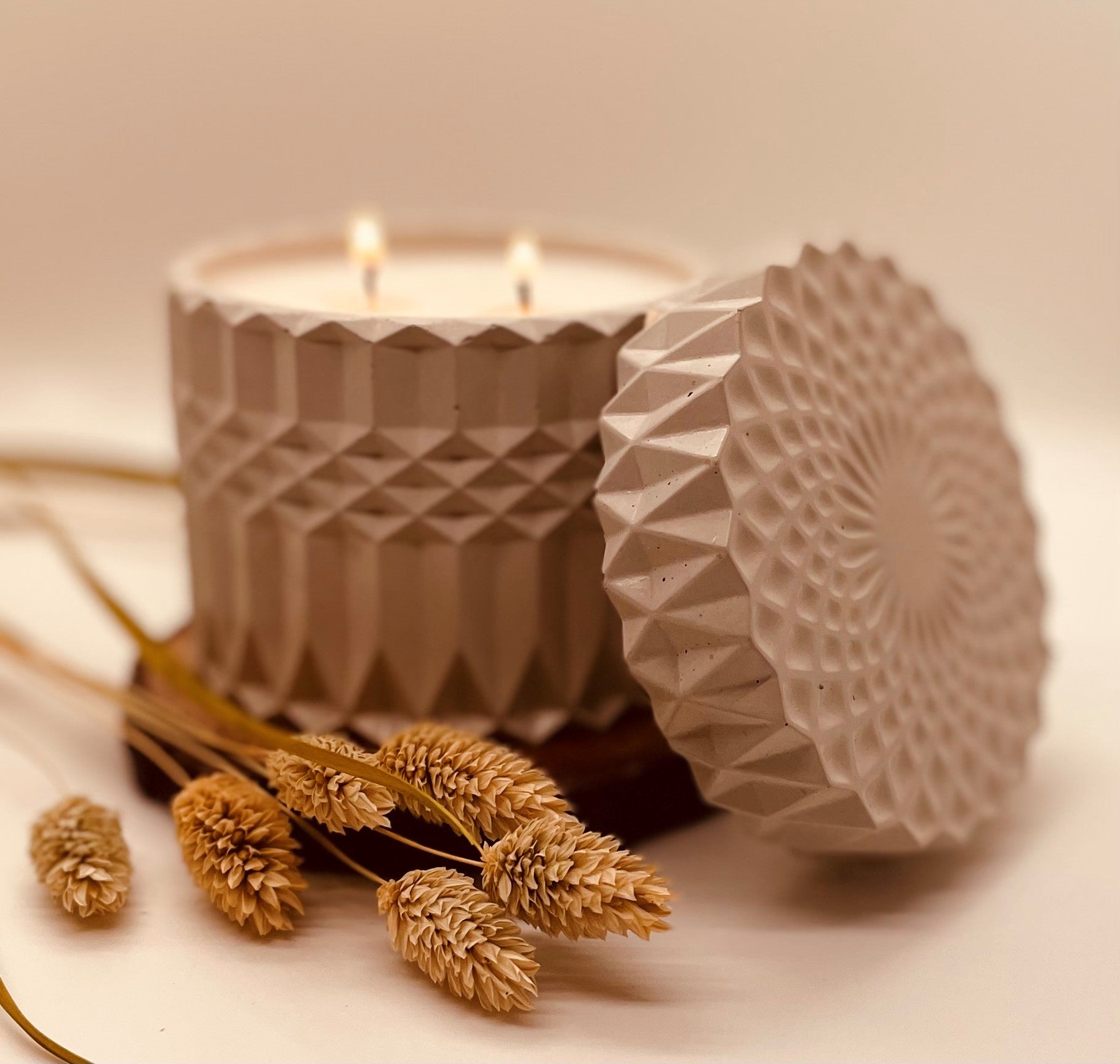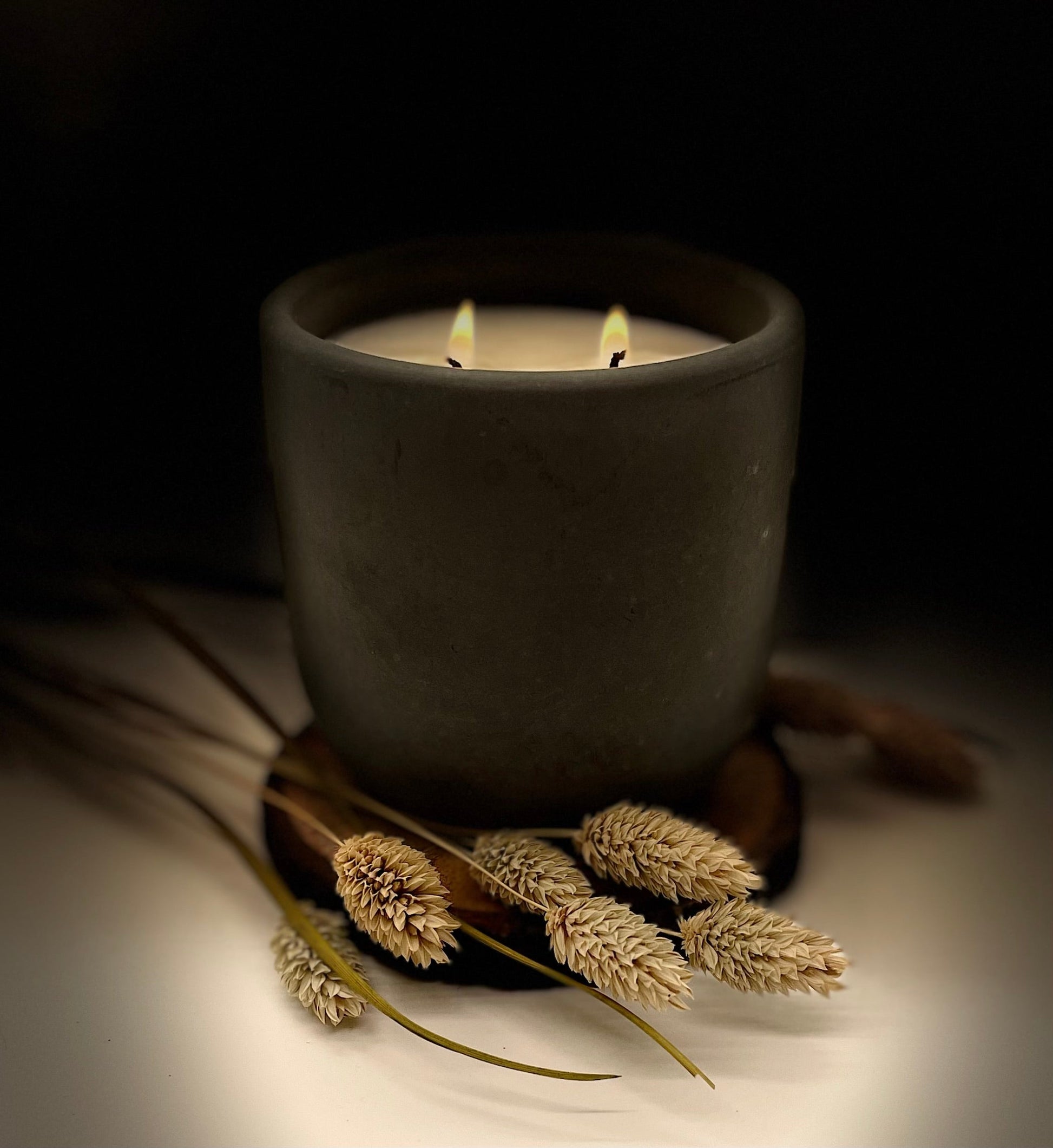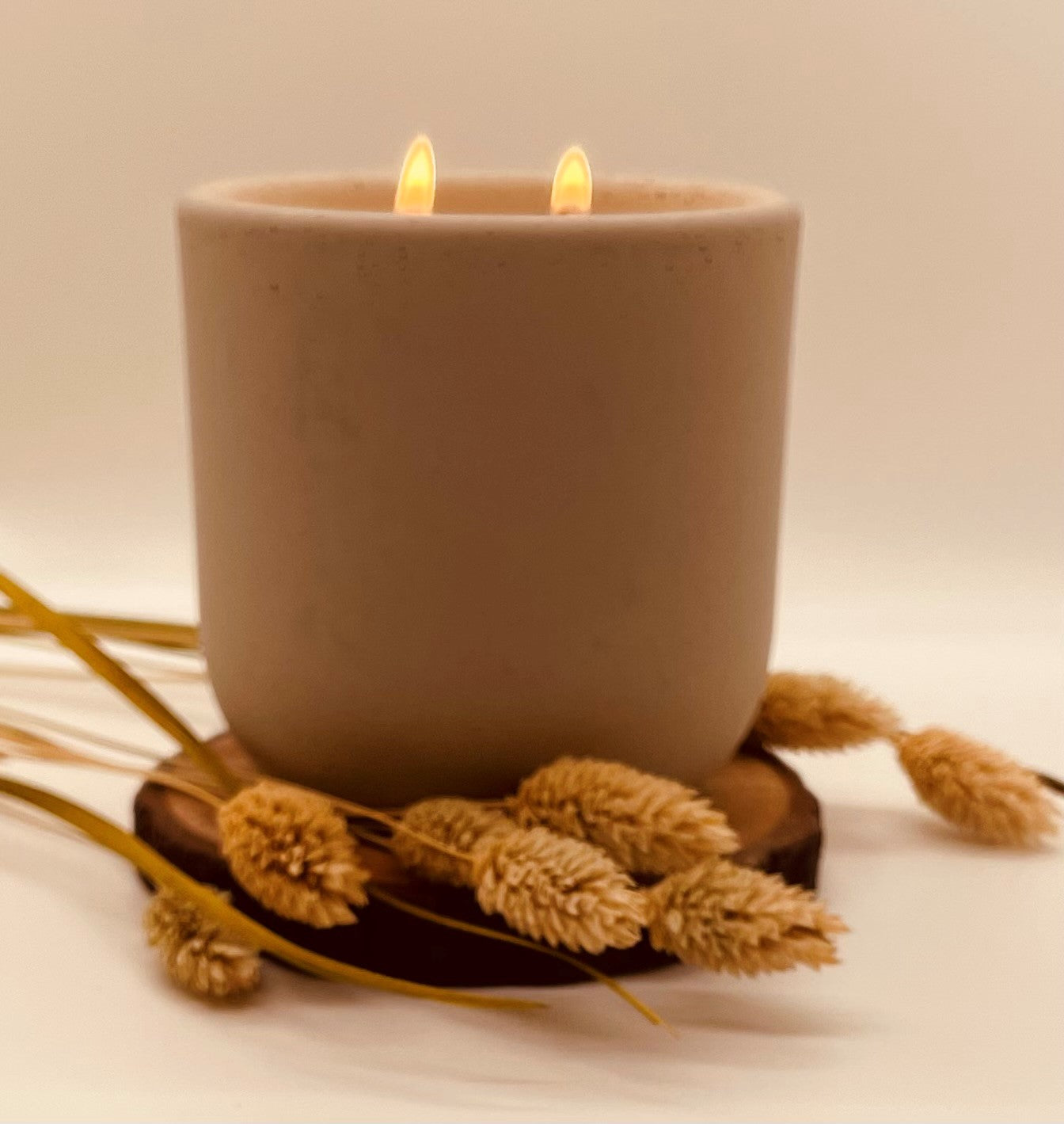 We pride ourselves on uniquely scented candles. Each candle is hand poured and our containers are handmade using concrete. We use a soy blend wax which results in a fragrant candle with a slow and clean burn. Our candles are double wicked which results in an even burn with stunning ambience.