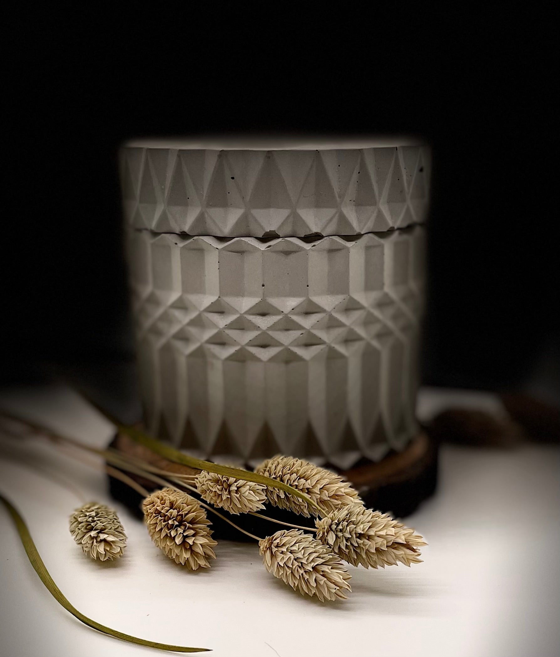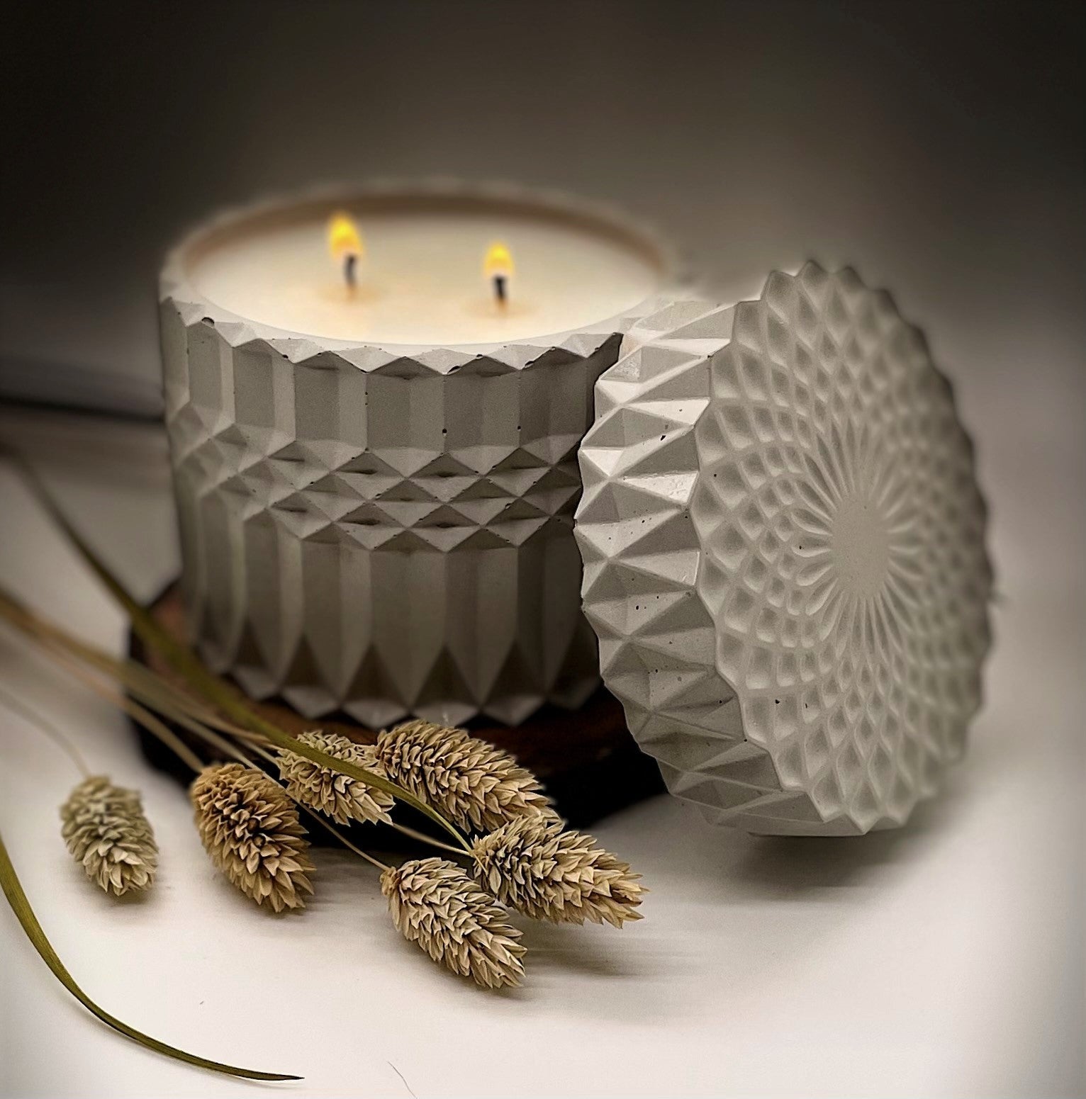 We offer two different styles of containers, a 3.5" tall tulip shape or a 3" tall geometrical lidded container. Both styles contain 8.5 ounces of wax. Once the candle has burned completely, you can reuse the concrete container. Common reuse options include; planting a succulent, pen holder, flower vase, or trinket holder.