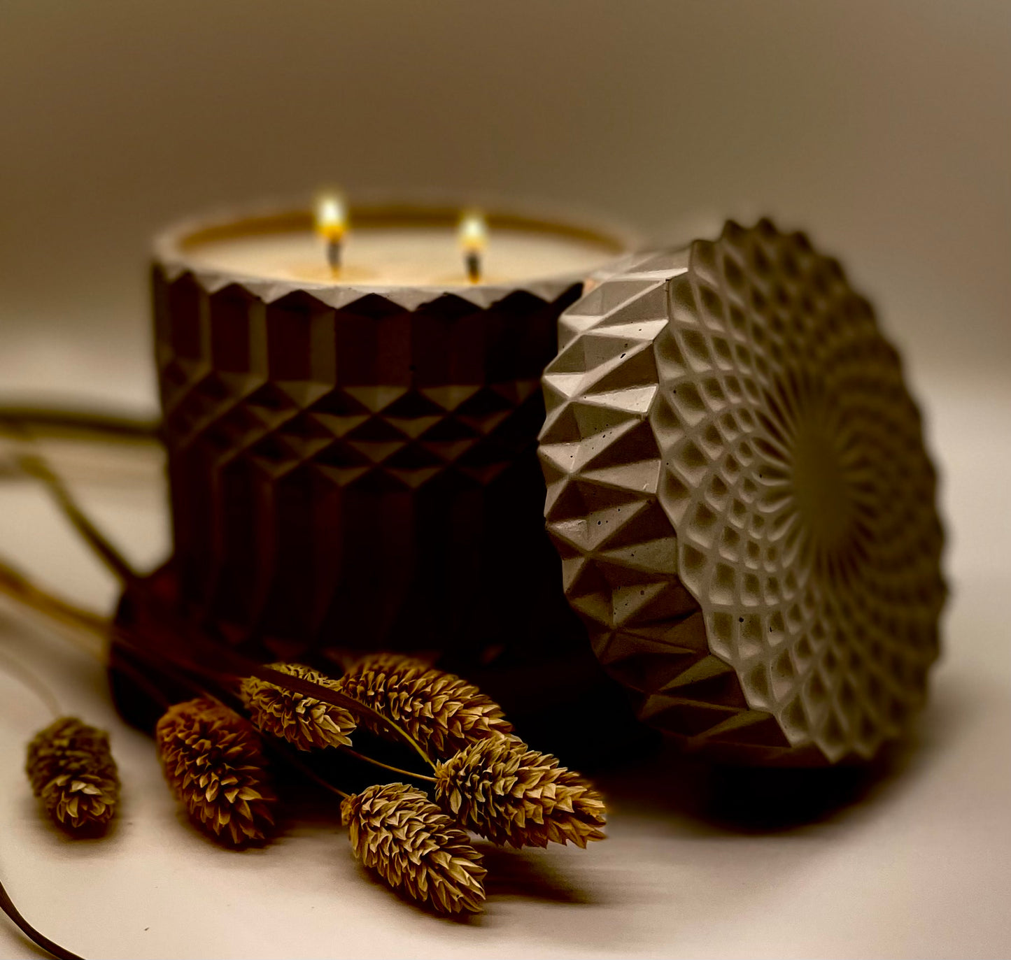 We pride ourselves on uniquely scented candles. Each candle is hand poured and our containers are handmade using concrete. We use a soy blend wax which results in a fragrant candle with a slow and clean burn. Our candles are double wicked which results in an even burn with stunning ambience.